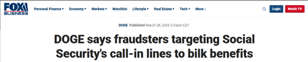 March 27, 2025, DOGE engineer says: “We learned 40 percent of the calls that they get are from fraudsters.” \[ P(\mbox{fraudster}|\mbox{call to SSA})=0.40 \]