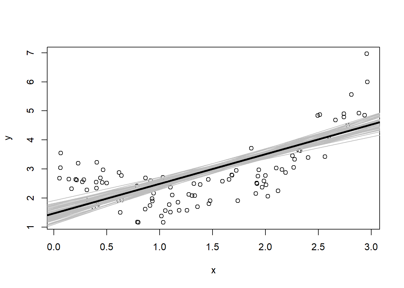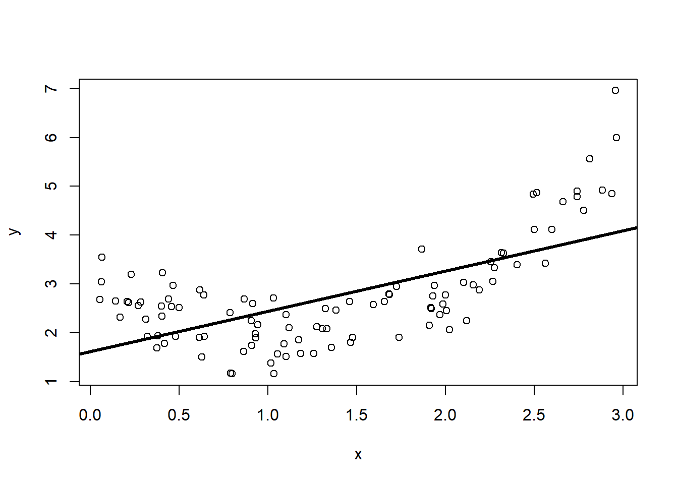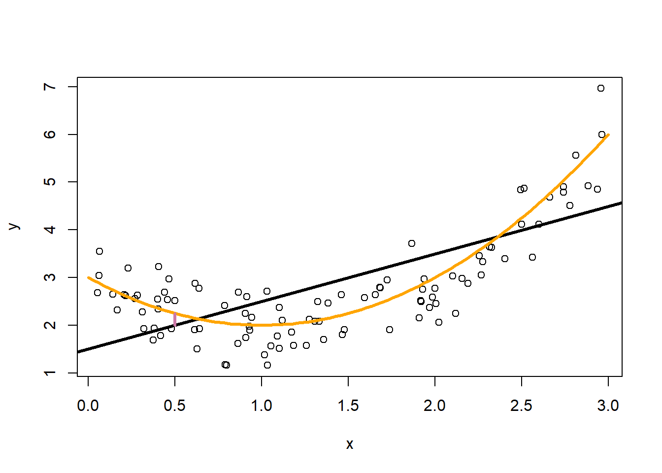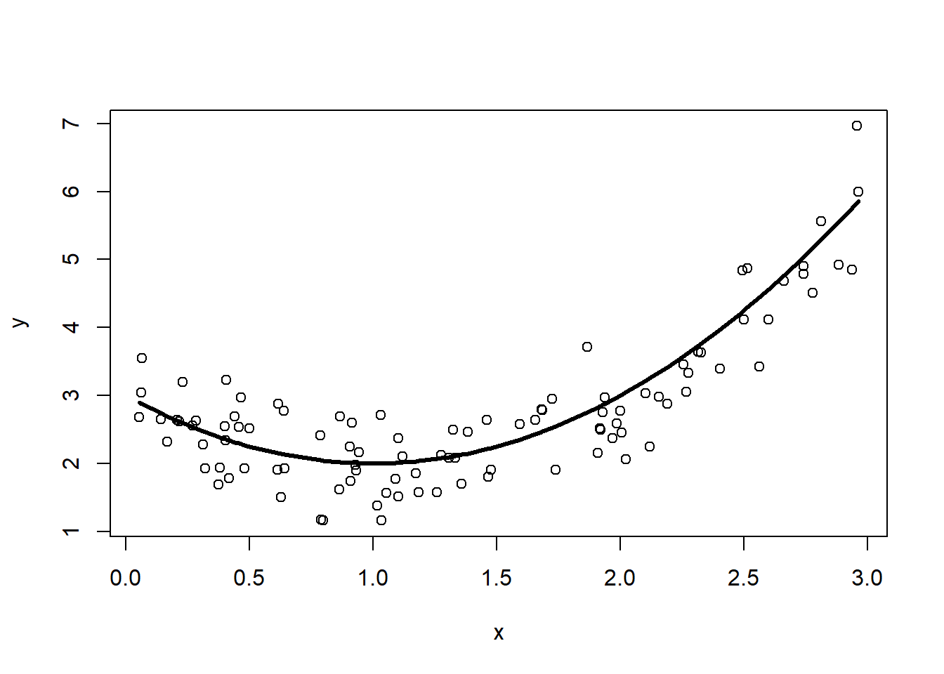 library(dplyr)n <-100d <-data.frame(x =runif(n, 0, 3) |>sort()) |># here is the true f(x) (normally unknown to us)mutate(fx = (x-1)^2+2) |># add some noise unrelated to x,y# rnorm(mean, std deviation)mutate(y = fx +rnorm(n, 0, sqrt(0.25)))plot(y~x, data=d)lines(fx~x, data=d, lwd=3)