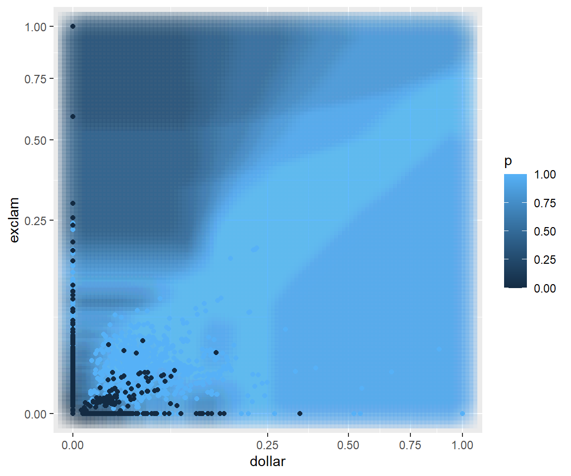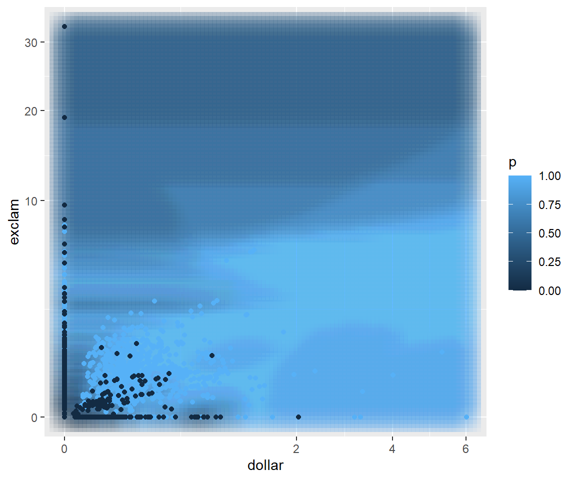 # extract the probability of predicted class from knnPreddGrid$p <-attributes(knnPred)$prob# convert to P(spam)dGrid$p <-ifelse(knnPred=="1", dGrid$p, 1-dGrid$p)