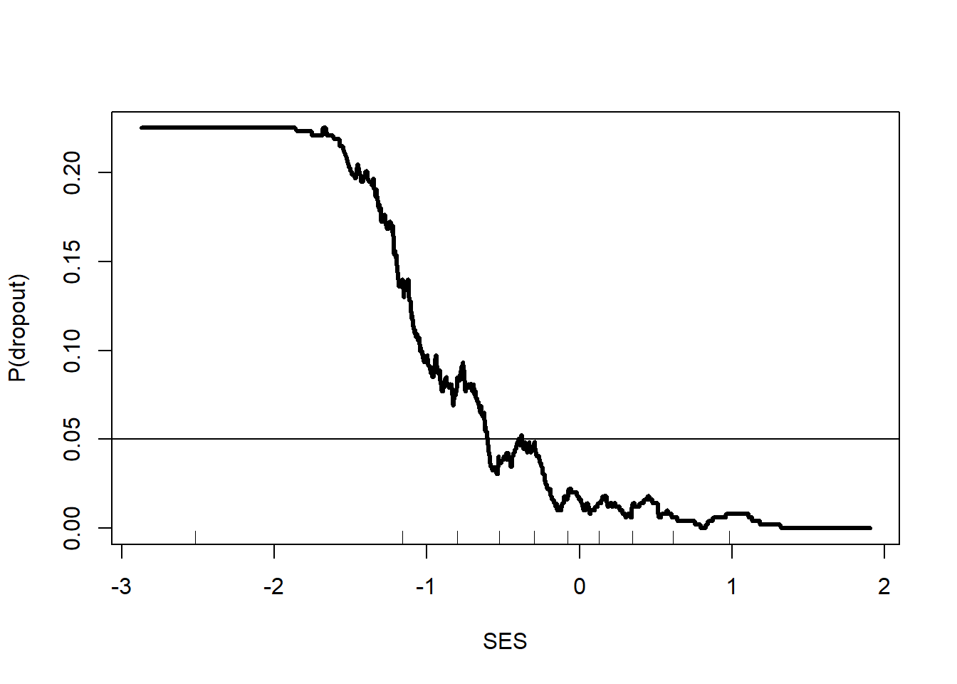 This figure shows strong threshold and saturation effects. A threshold effect is when the effect of a feature does not kick in until it reaches a certain threshold. Note that SES does not seem to matter (according to the 1000-nn model) until SES exceeds -1.5. Then increases in SES sharply decrease the risk of dropout. Saturation effects are when additional increases in a feature provide no additional changes to the outcome. Once SES exceeds 1.0, there is no further change in the dropout risk. Threshold and saturation effects are exceedingly common in reality. Yet many prediction models only consider linear combinations of features, which will always have bias that cannot be removed with additional data. One of the benefits of the knn classifier is that it can capture any relationship that might exist in the data.