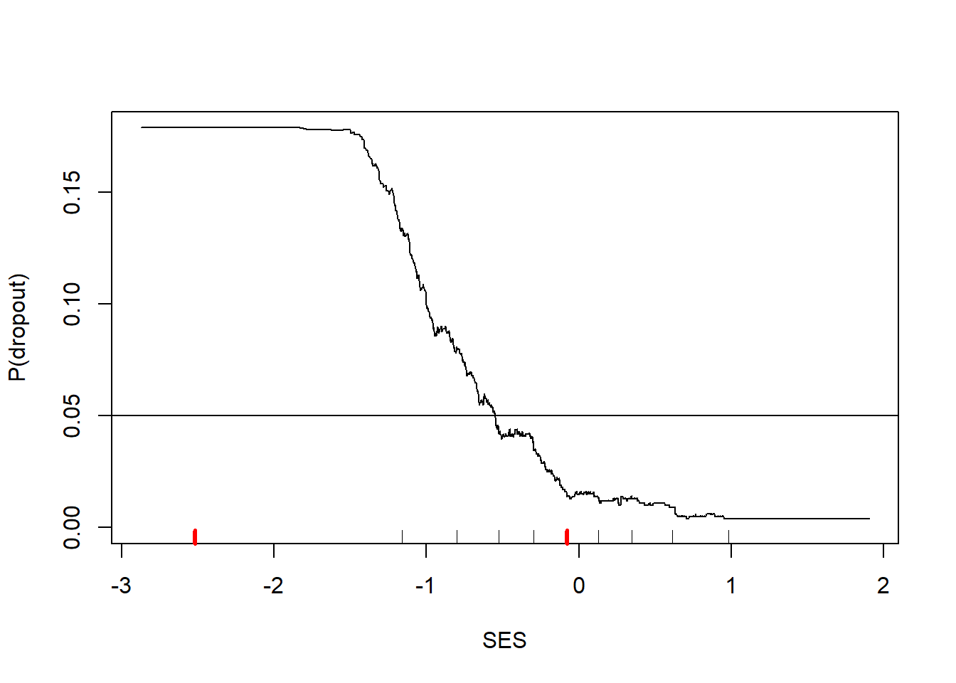 Warning in rug(quantile(dTrain$ses, probs = (0:2)/2), col = "red", lwd = 3):