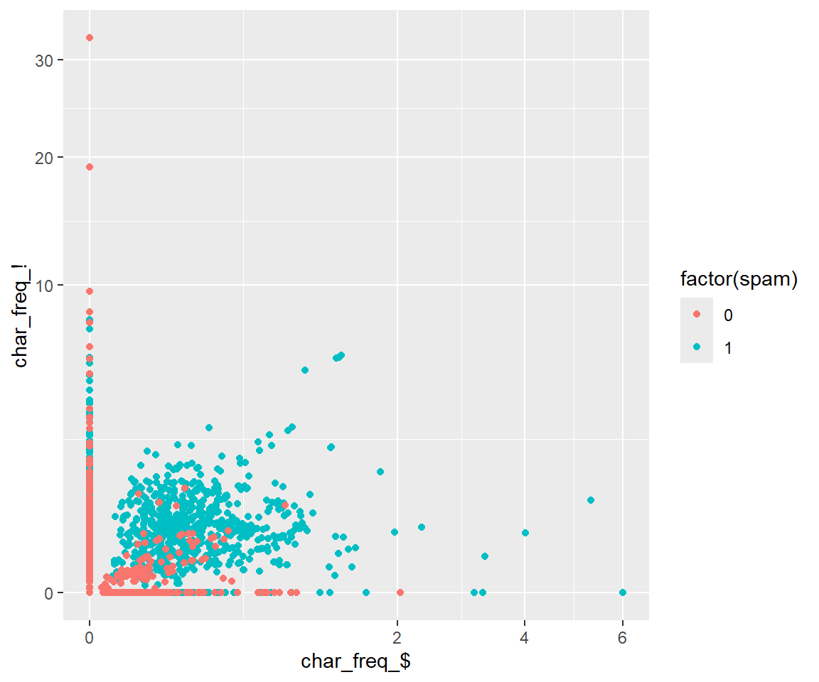 library(ggplot2)ggplot(dSpam, aes(`char_freq_$`, `char_freq_!`, color =factor(spam))) +geom_point() +scale_x_continuous(trans='sqrt') +scale_y_continuous(trans='sqrt')