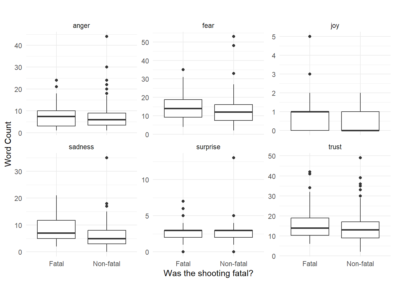 In addition to binary positive/negative sentiment, we can use the NRC lexicon (Mohammad and Turney 2013) to examine a broader range of emotions, such as fear, anger, trust, and sadness. This gives us a more nuanced view of how OIS reports are framed.