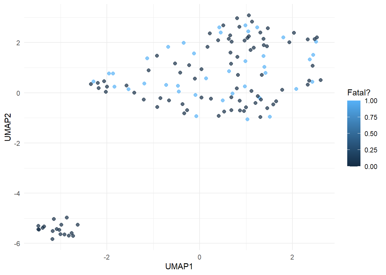 We then used dimensionality reduction techniques like singular value decomposition (SVD) and UMAP to visualize documents in a low-dimensional space, revealing thematic clusters such as reports involving dog shootings or knife attacks. We used k-means clustering to group similar documents and we a built classification model to predict whether an incident was fatal based on the text content. Throughout, we emphasized the importance of preprocessing choices, like stopword removal, stemming, and n-gram inclusion, and how they shape downstream analysis.