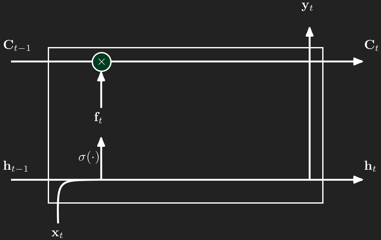 \[ \begin{aligned} \mathbf{f}_t(\mathbf{x}_t,\mathbf{h}_{t-1}) &= \sigma\left(\mathbf{W}_{xf}\mathbf{x}_t + \mathbf{W}_{hf}\mathbf{h}_{t-1}\right) \\ \mathbf{C}_t &= \mathbf{f}_t \odot \mathbf{C}_{t-1} + \text{more to come here...} \end{aligned} \]