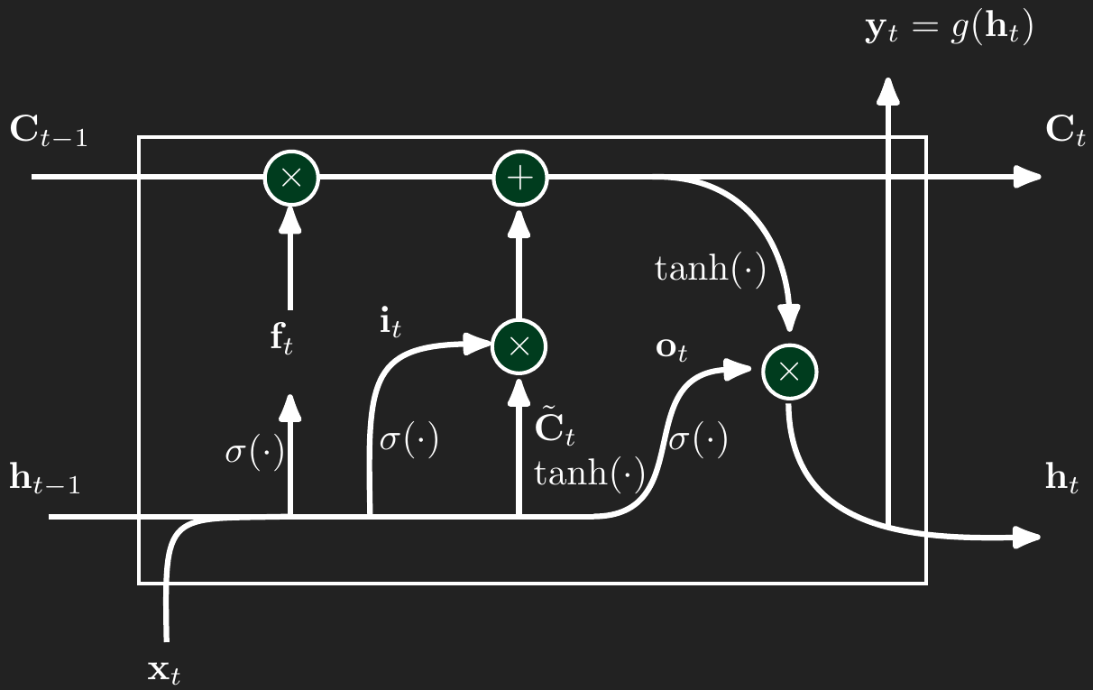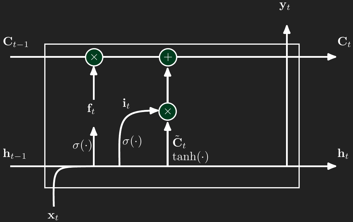 Like the standard RNN, the cell for timepoint \(t\) has an input, \(\mathbf{x}_t\), a hidden “short-term” memory, \(\mathbf{h}_t\), and an output, \(\mathbf{y}_t\). In addition to those standard features, LSTMs add a long-term memory component, \(\mathbf{C}_t\). All of these components are vectors. In deep learning applications \(\mathbf{C}_t\) can be a vector of dimension 1,024 or more. In simpler applications or for time series forecasting, \(\mathbf{C}_t\) can be a smaller vector with dimension like 64 or 128. The dimension of \(\mathbf{C}_t\) does need to match the dimension of \(\mathbf{h}_t\).