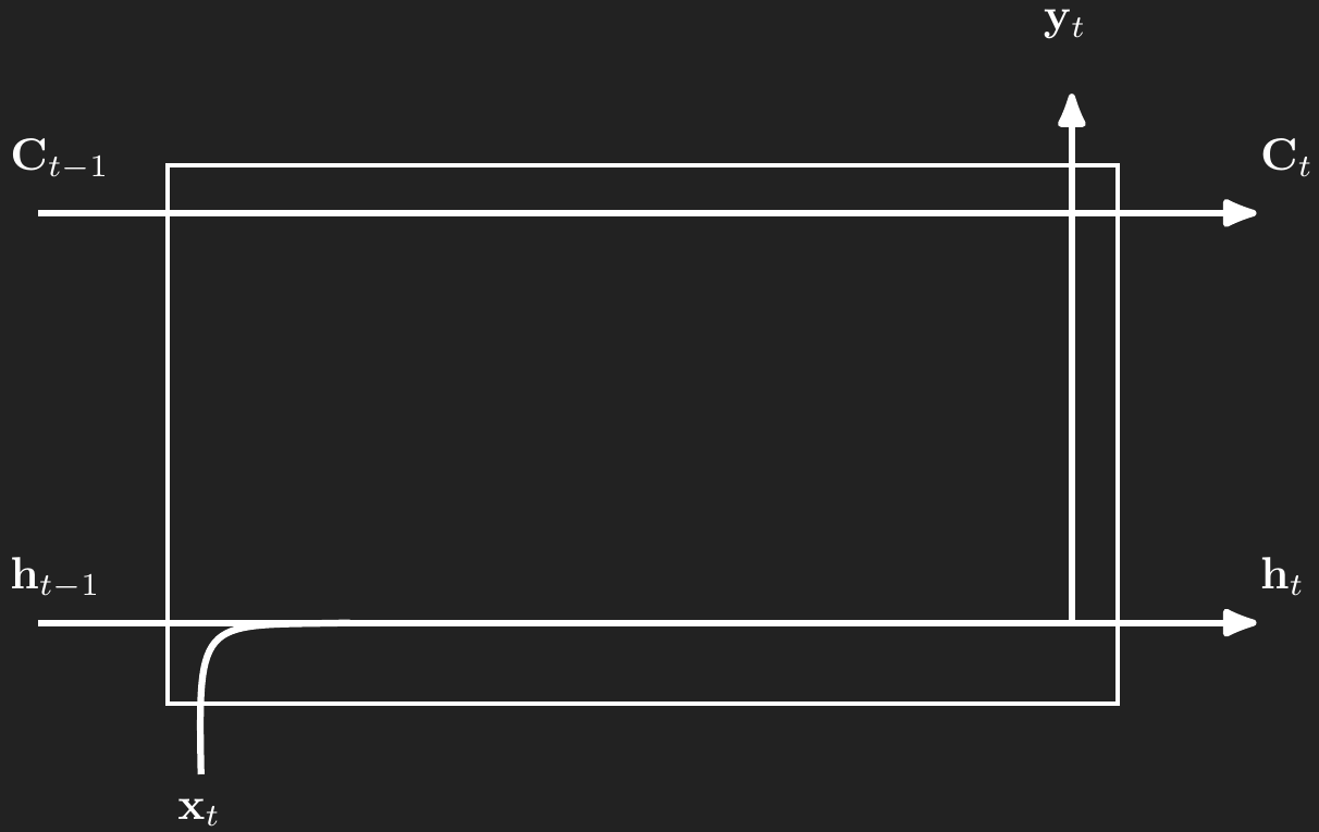 LSTMs look just like Figure 1, but add more complexity to the cell between \(\mathbf{x}_t\) and \(\mathbf{y}_t\). We will through the components, long-term memory, forget gates, input gates, and output gates.