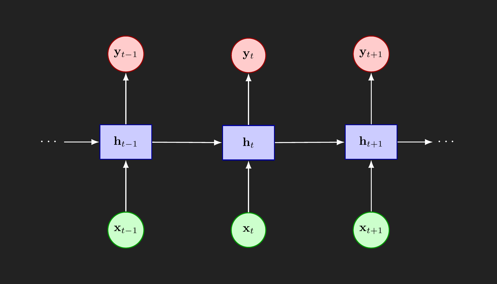 \[ y_t = W_{hy} h_t \] or \[ y_t = g(W_{hy} h_t) \] where \(\sigma(\cdot)\) is some activation function.